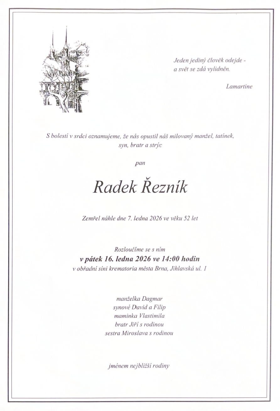S lítostí a hlubokým zármutkem přijímáme a sdělujeme smutnou zprávu, že nás v krátkém časovém sledu opustil další člen naší fotbalové organizace. Ve věku 52 let náhle odešel náš trenér - pan Radek Řezník.